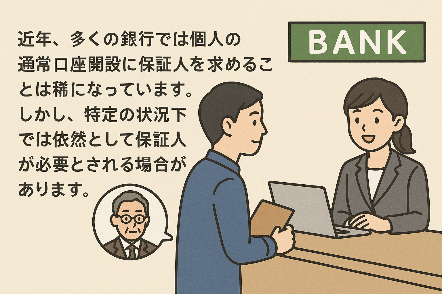 近年、多くの銀行では個人の通常口座開設に保証人を求めることは稀になっています。