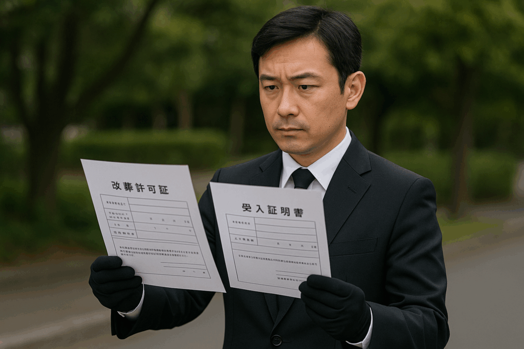 新しい納骨先(寺院・霊園・納骨堂)から「受入証明書」を取得してから、旧墓地管理者へ「埋葬証明書」を依頼し、書類を揃えて申請します。