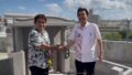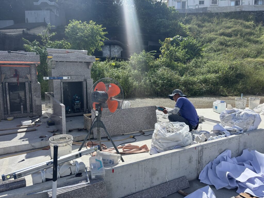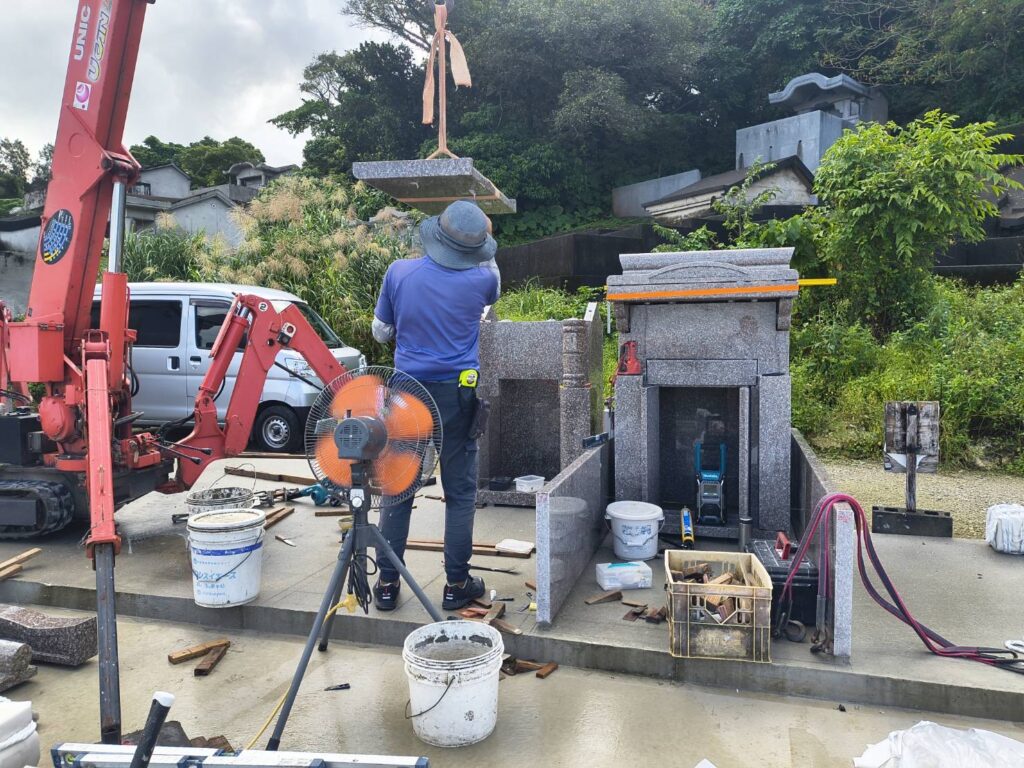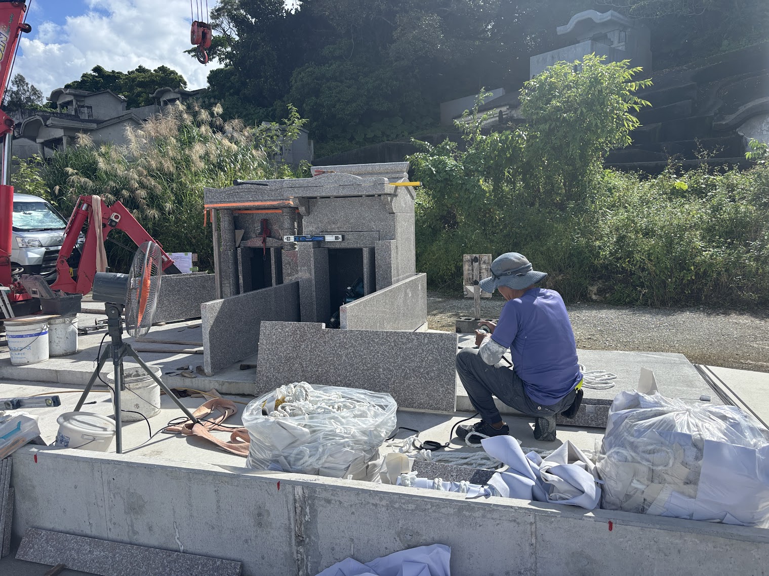 雨上がりの中でお墓の組み立ての作業の風景です。