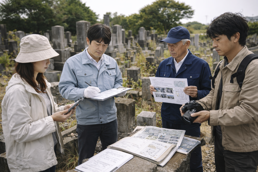 現地では墓石の有無、倒壊・破損状況、銘文の判読可否、周囲の管理状態を確認します。