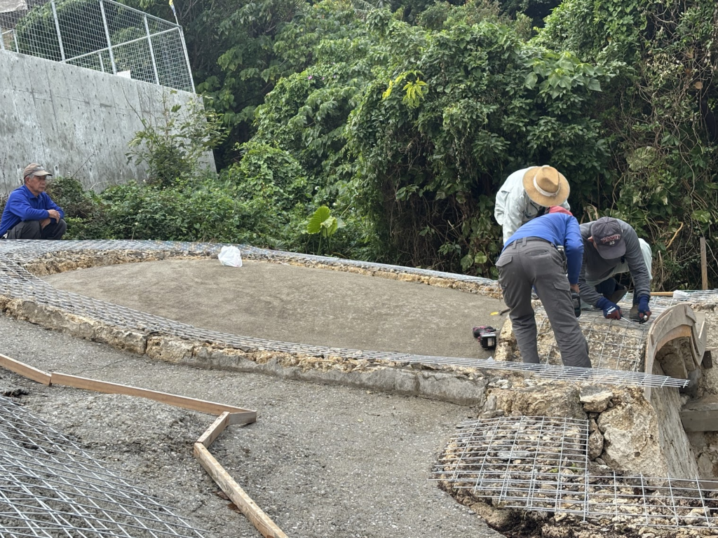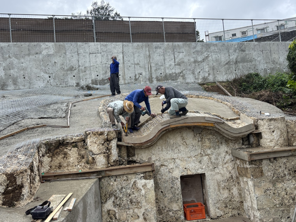 お墓の改修に破壊しているお墓の屋根を修正しています。②
