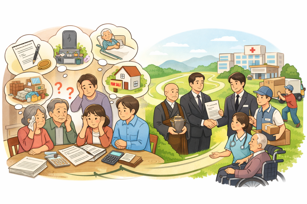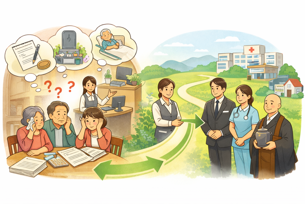 終活は、お墓・供養・相続・身元保証・遺品整理・不動産など、想像以上に分野が広く、ご本人やご家族だけで全体を整理するのは大きな負担です。