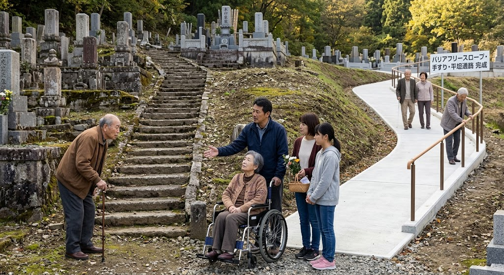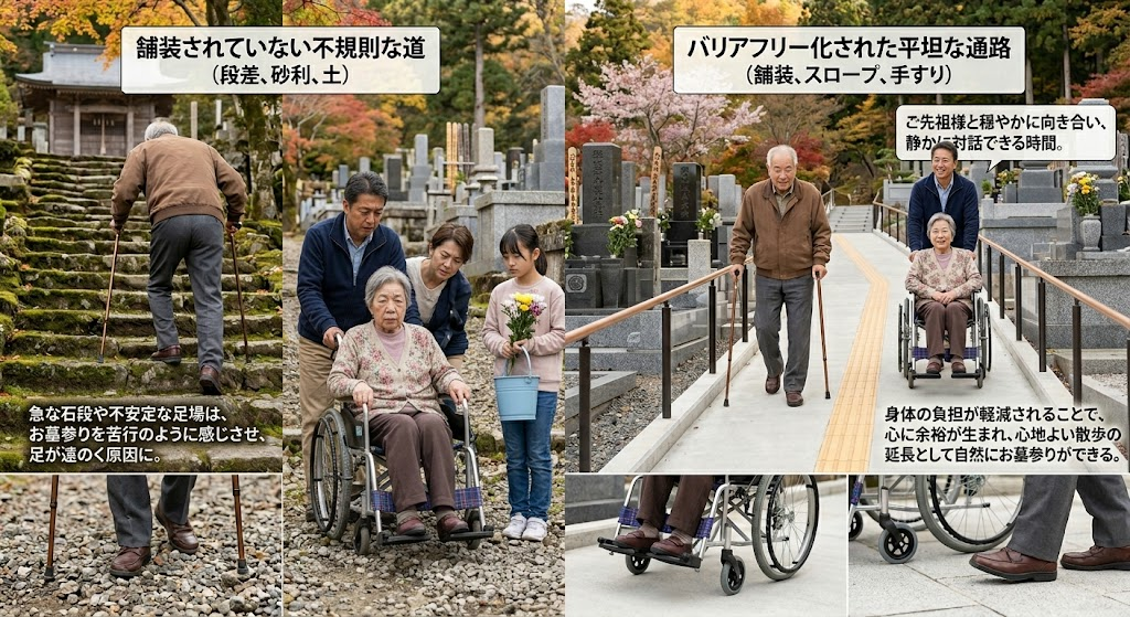 お墓参りは故人を偲ぶ大切な時間ですが、階段や坂道が多いと高齢者や身体の不自由の方々に大きな負担になります。
