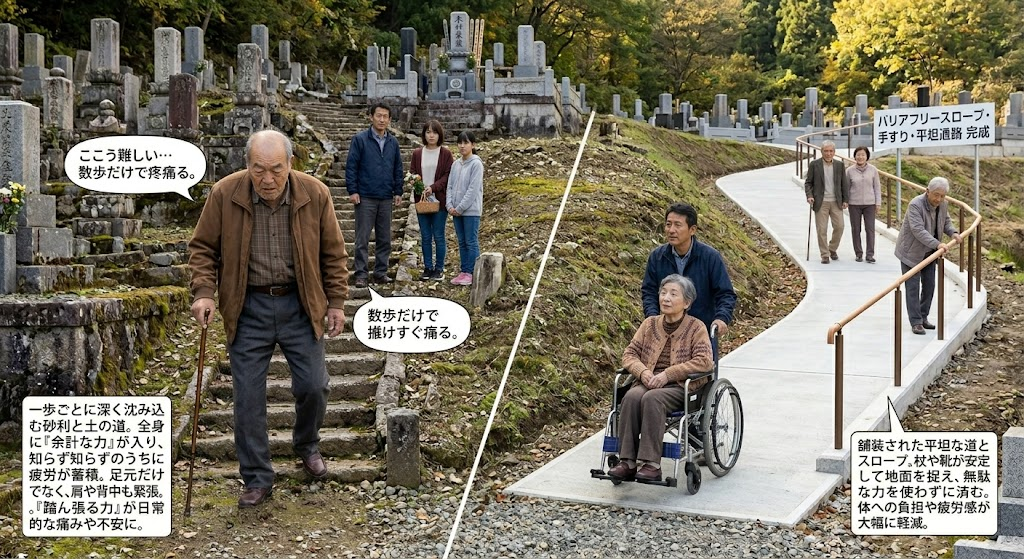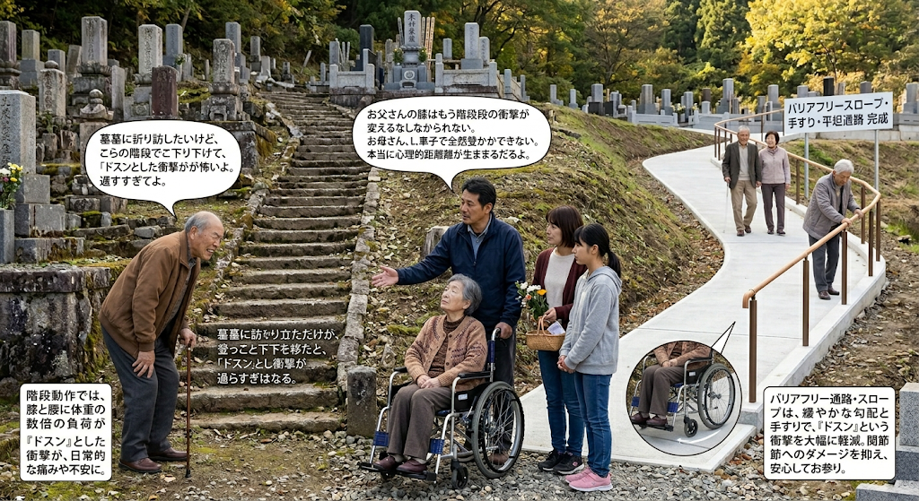 霊園のバリアーフリーが良い理由②安全面でのメリット:足・腰への負担軽減(動画解説付き)